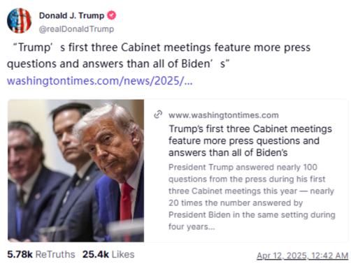 这届美国政府为了显示透明度和民主授权,一直通过新闻媒体以及社交媒体高频向公众沟通,可以说是沟通密度最高的政府。特朗普自己在社交平台上得意的转发支持他的媒体对他的赞美:"特朗普前三次内阁会议接受和回答的媒体问题比拜登整个任期都多"(图5)。但任何稍微冷静的观察都会发现,特朗普内阁会议展示的实际上是一个大型表忠心现场,内阁成员不断表达对特朗普英明领导力的赞叹。