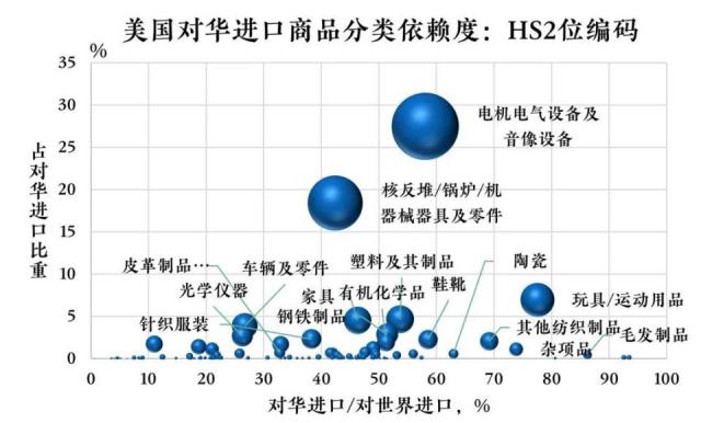 这个事实上的后撤来源于特朗普政府持续低估的一个重要事实:全球供应链的整合深度以及美国对部分中国进口商品的高度依赖。如图 13所示,2024年贸易数据显示,99个2位数HS编码的商品大类中,有22个分类商品对华依赖度超过了50%,规模达到2396.3亿美元,占整体美国对华商品进口的51.8%。