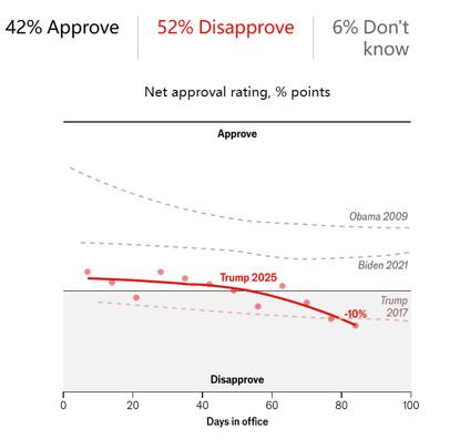 图11:特朗普净支持率快速下滑,比第一任期同样在职天数时更低;来源:《经济学人》网站。