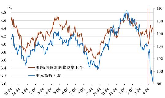 图7:关税"手术"后,美元指数与国债收益率背离;来源:Wind。分界线对应对等关税发布日。
